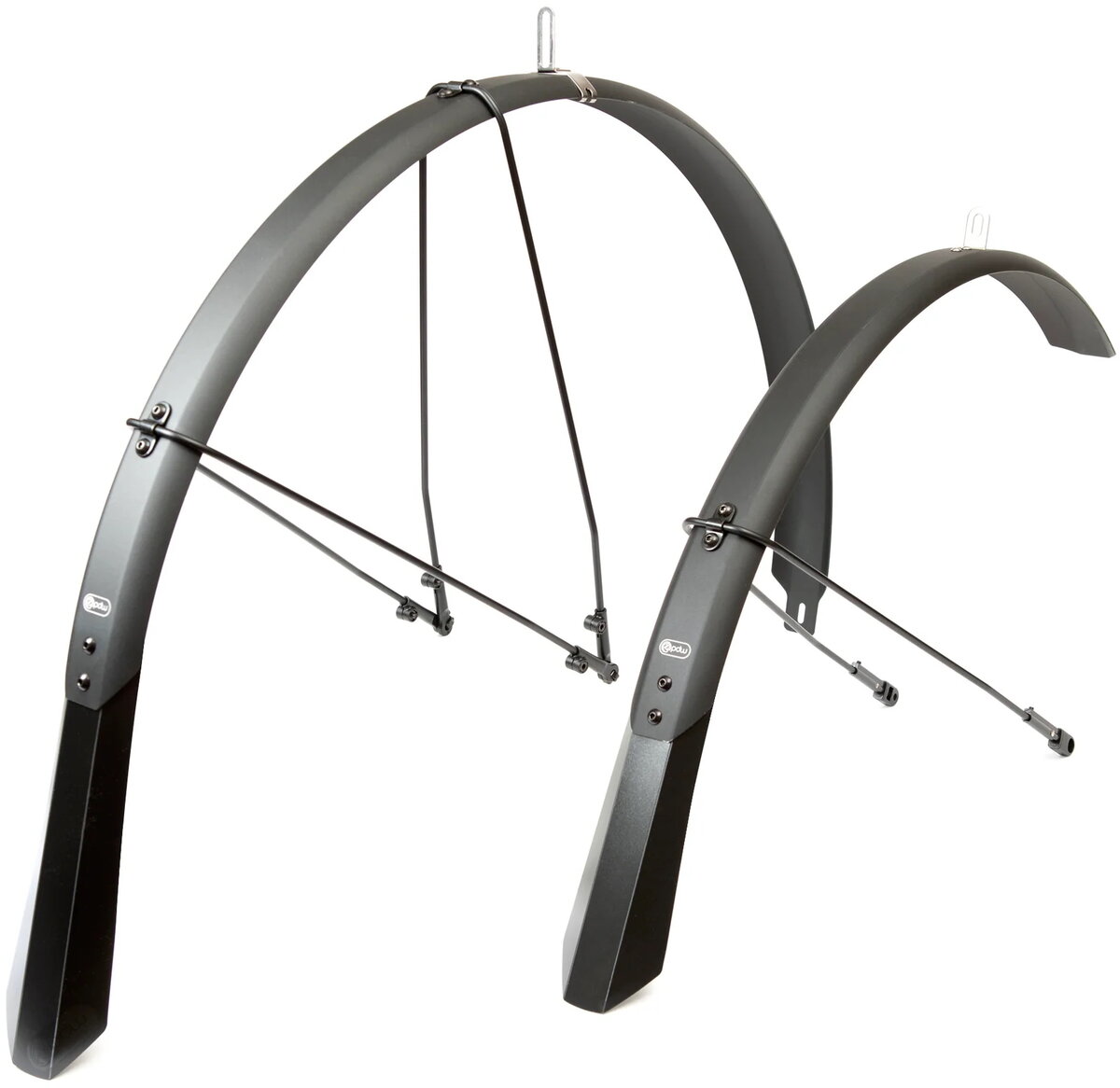 They provide full-wrap coverage, even shielding your shoes and riders on your rear wheel thanks to extra long and super flexible mudflaps. Safety release tabs ensure your wheels keep turning even if debris gets lodged between the fender and tire. The 700x55 Full Metal Fenders easily mount to bikes with eyelets using all stainless steel hardware which may be replaced as needed.